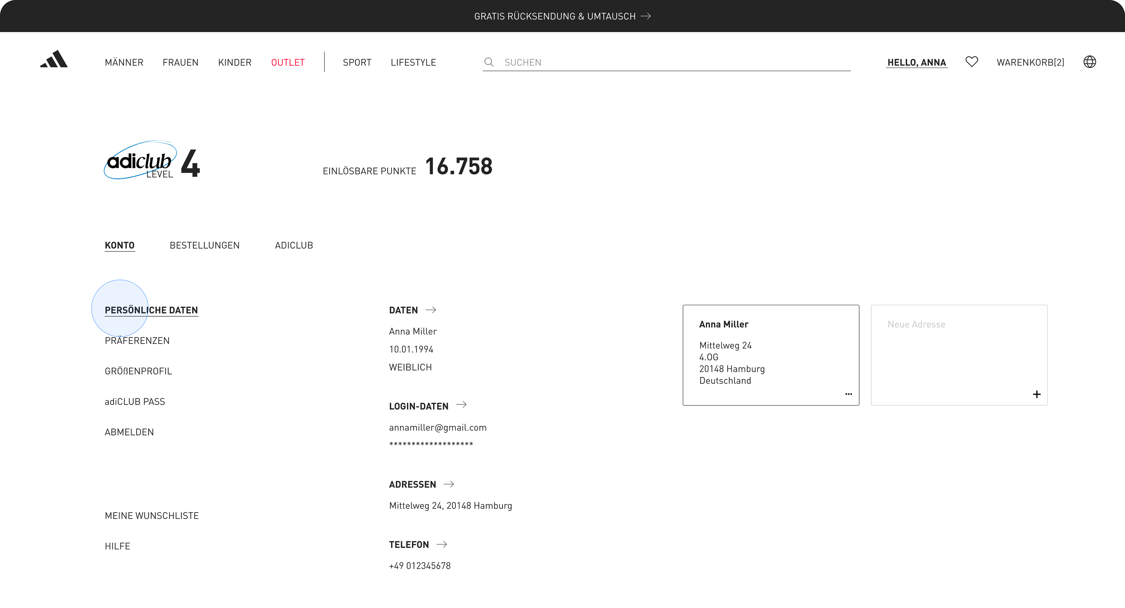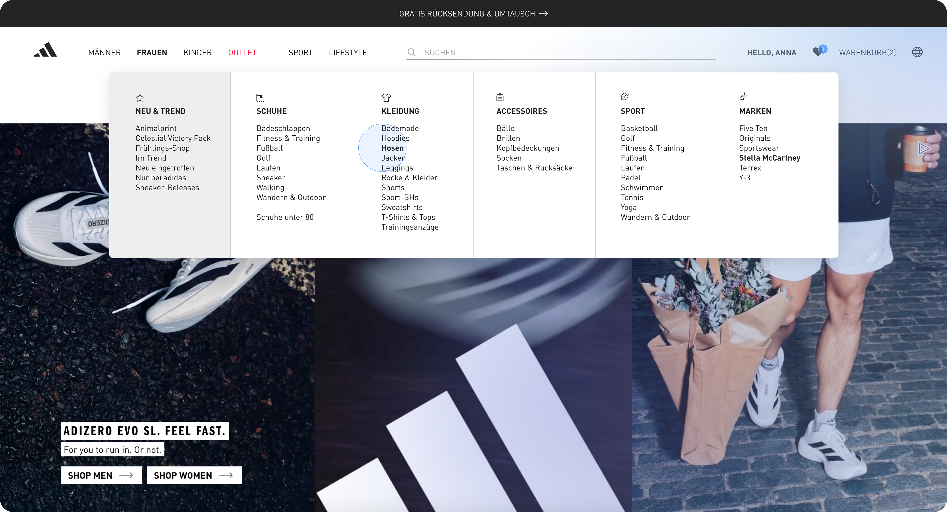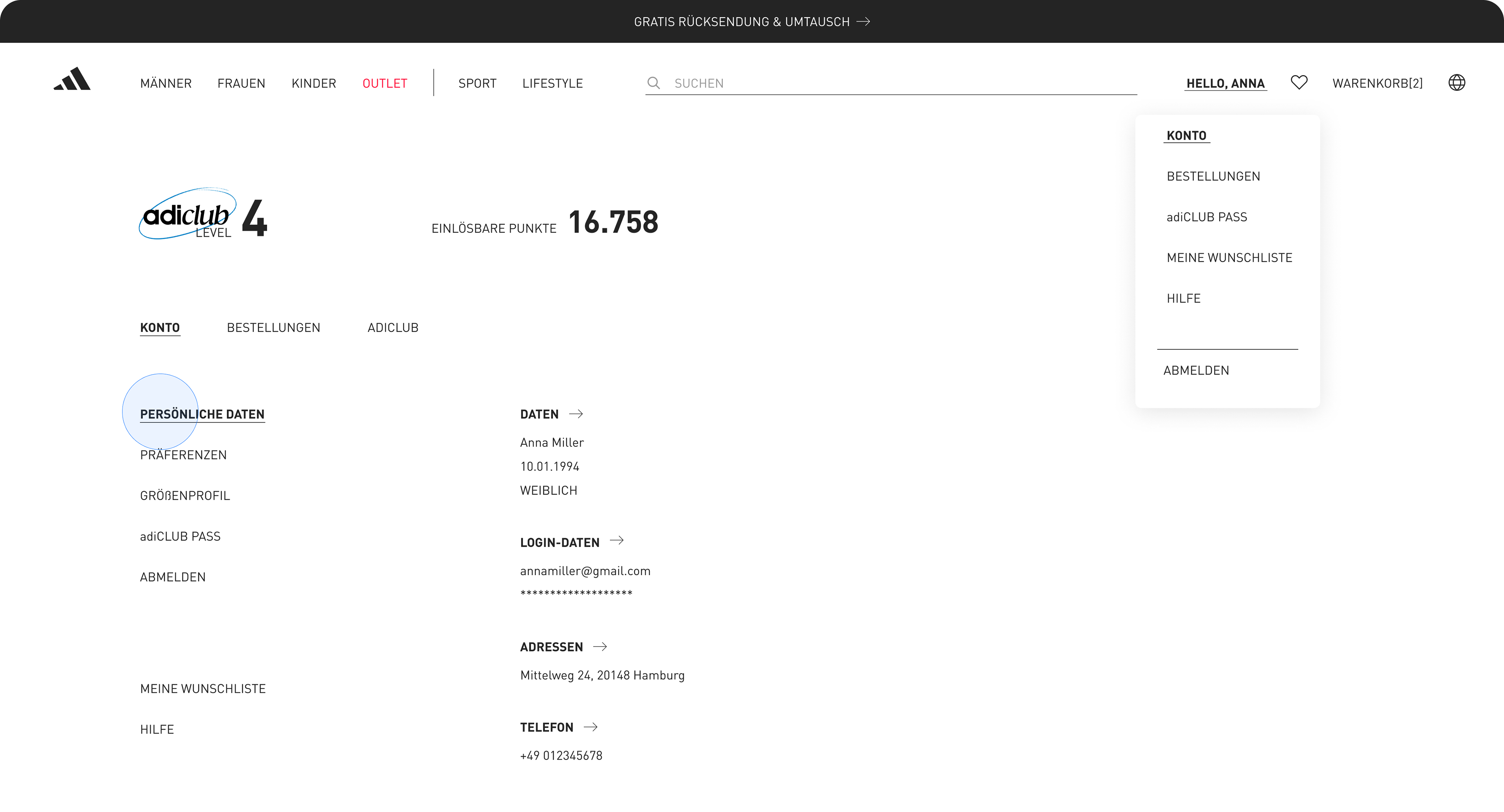 Enhancing menu navigation and account overview on adidas.de