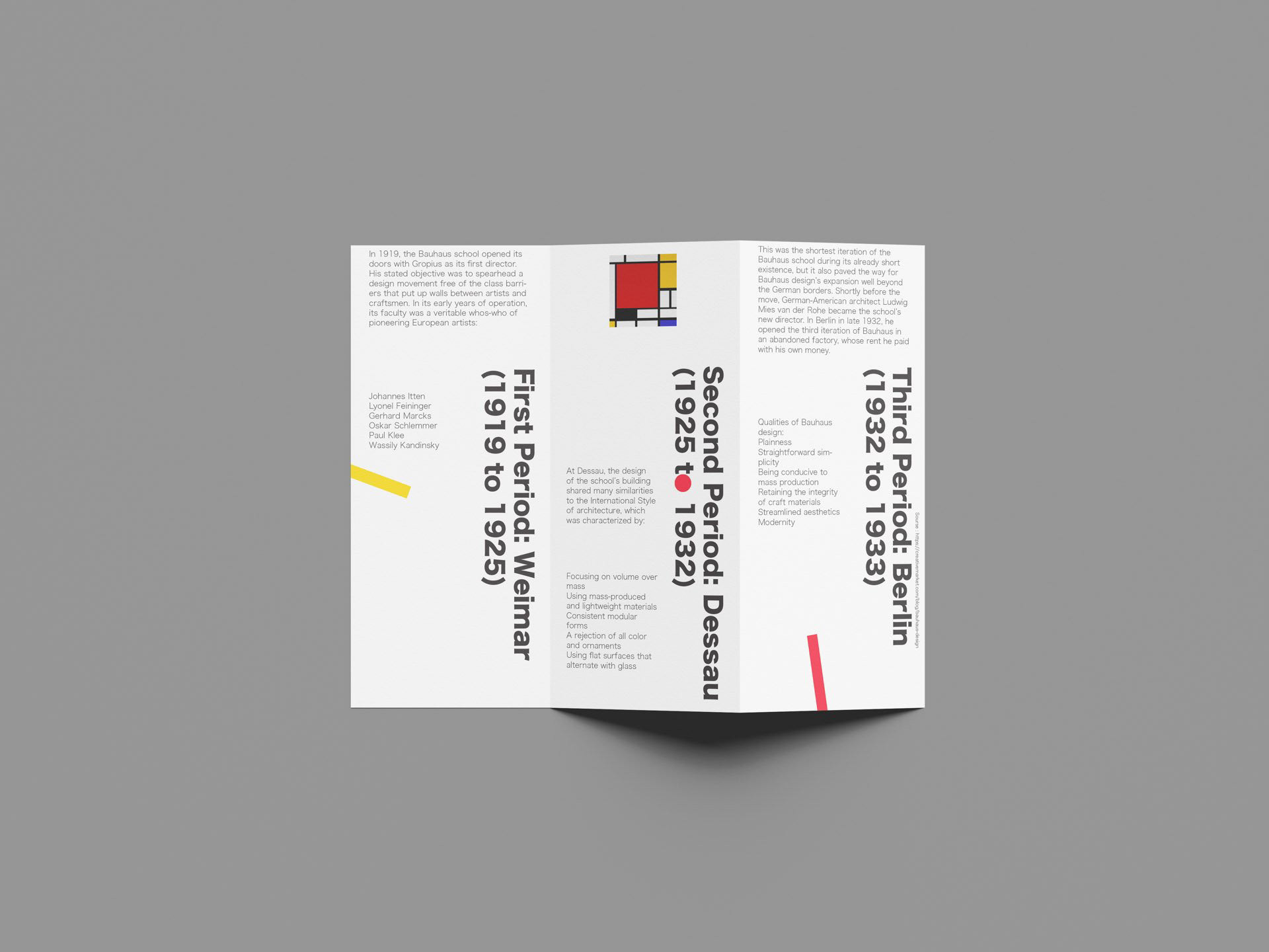 The challenge was to create a brochure that effectively communicates the essence of the Bauhaus movement while highlighting the diverse developments in art, architecture, graphic design, interior design, industrial design, and typography that will be featured in the exhibition. The design needed to embrace the simplicity, brevity, and iconic elements that define the Bauhaus style.