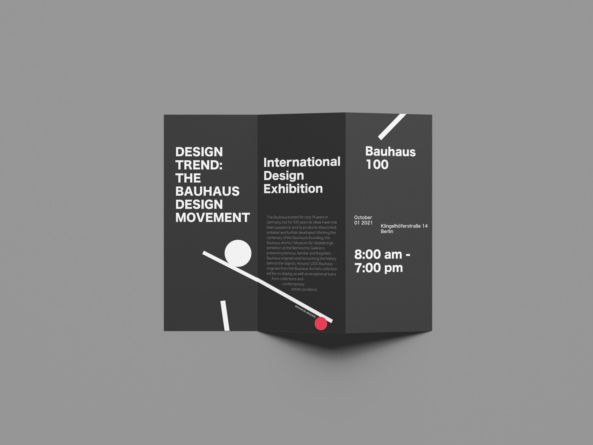 The brochure design follows Bauhaus principles of simplicity and uses geometric shapes for an organized layout. It incorporates iconic Bauhaus graphic elements and modernist typography. The brochure effectively portrays the upcoming exhibition's celebration of Bauhaus movement's impact on creativity and innovation.