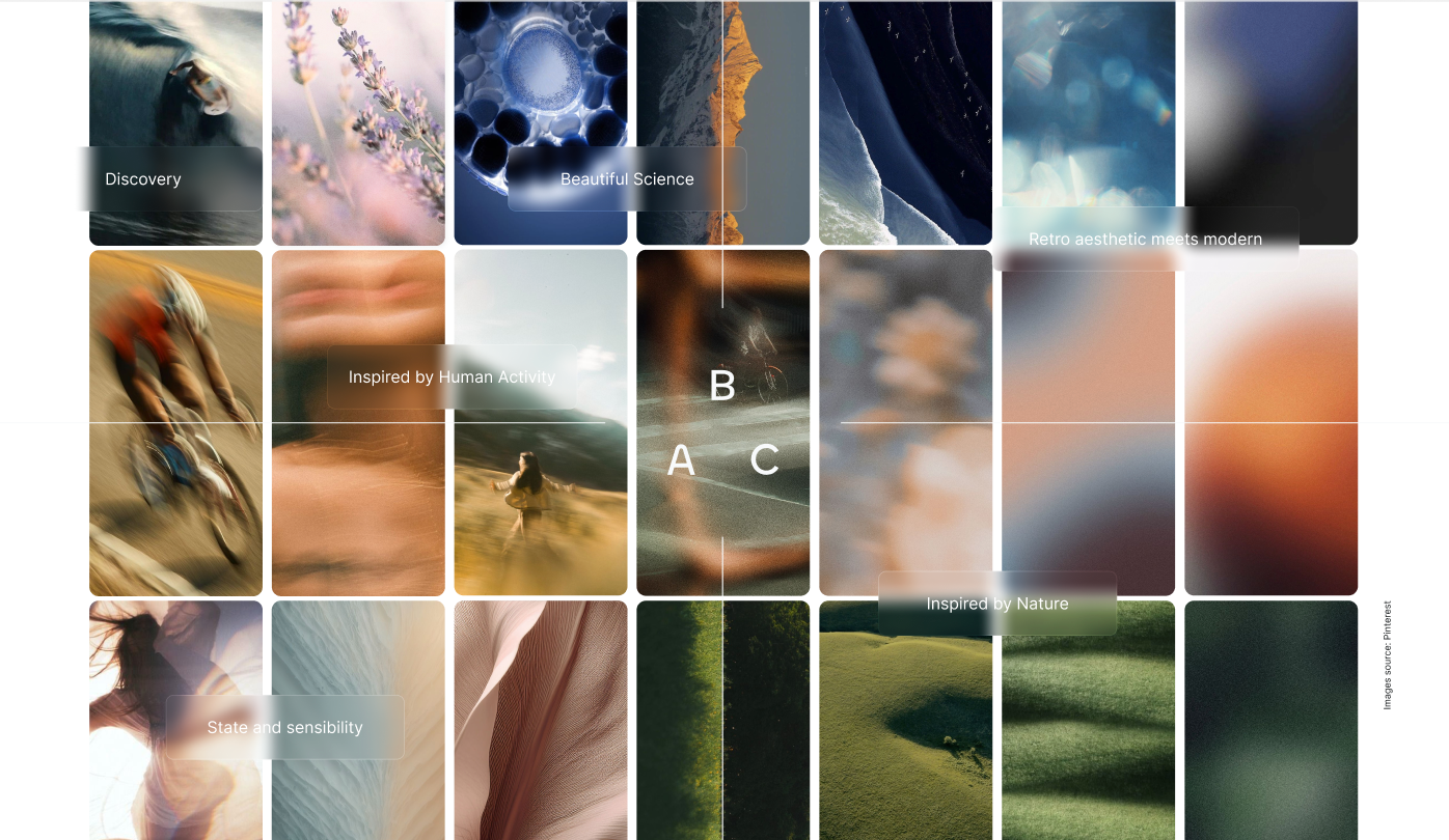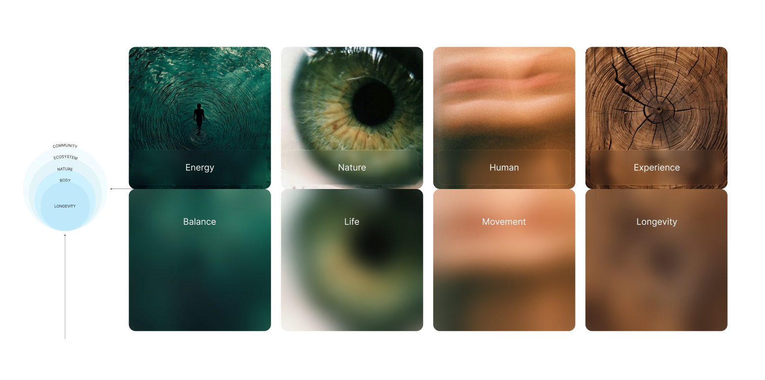 Our visual language is built on the idea that life, like longevity, is made of reflections and layers. Every element - from typography to color -carries more than one meaning. A surface may reflect clarity, but beneath it lies depth; a tone may appear simple, but together with others it creates richness.