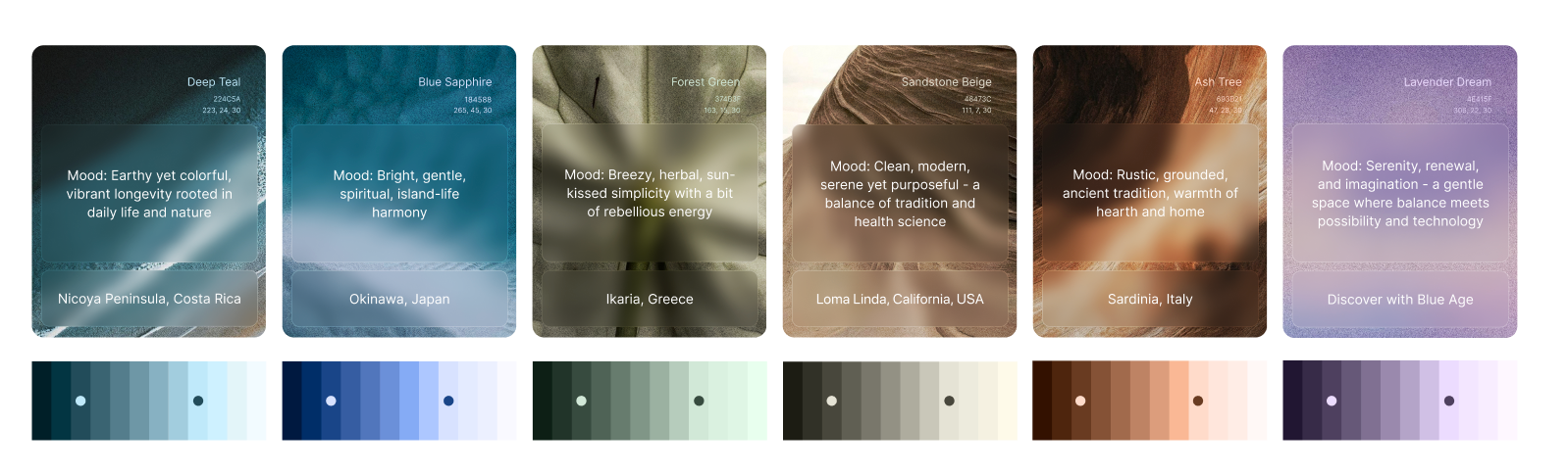 The Blue Age Club color palette is drawn from the landscapes and atmospheres of meaningful locations around the world. Each shade reflects the spirit of places where people live in balance with nature and community - the deep blues of the sea, the earthy warmth of stone and soil, the soft greens of olive groves, and the sunlit tones of open skies. By grounding our identity in these natural hues, we celebrate timeless beauty, cultural heritage, and the harmony between people and their environment.