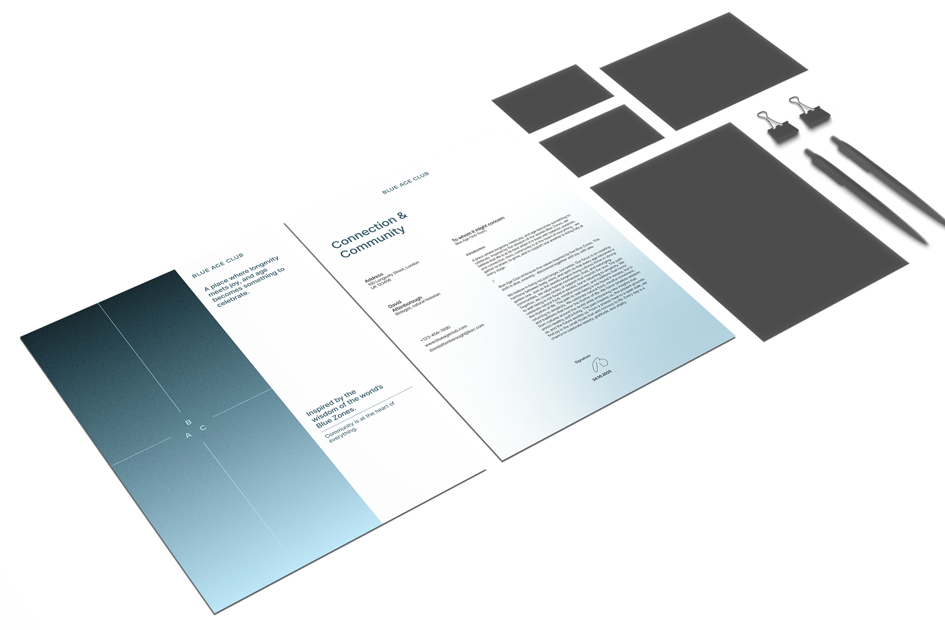 Blue Age Club embodies a sense of calm, balance, and timeless elegance. Our visual identity is designed to feel warm, inviting, and grounded, while inspiring vitality and curiosity. Through natural tones, thoughtful typography, and clean layouts, we create a space that encourages connection, reflection, and mindful living. Every touchpoint, from colors to imagery, sets a mood of serene sophistication - a place where longevity, joy, and purpose meet.