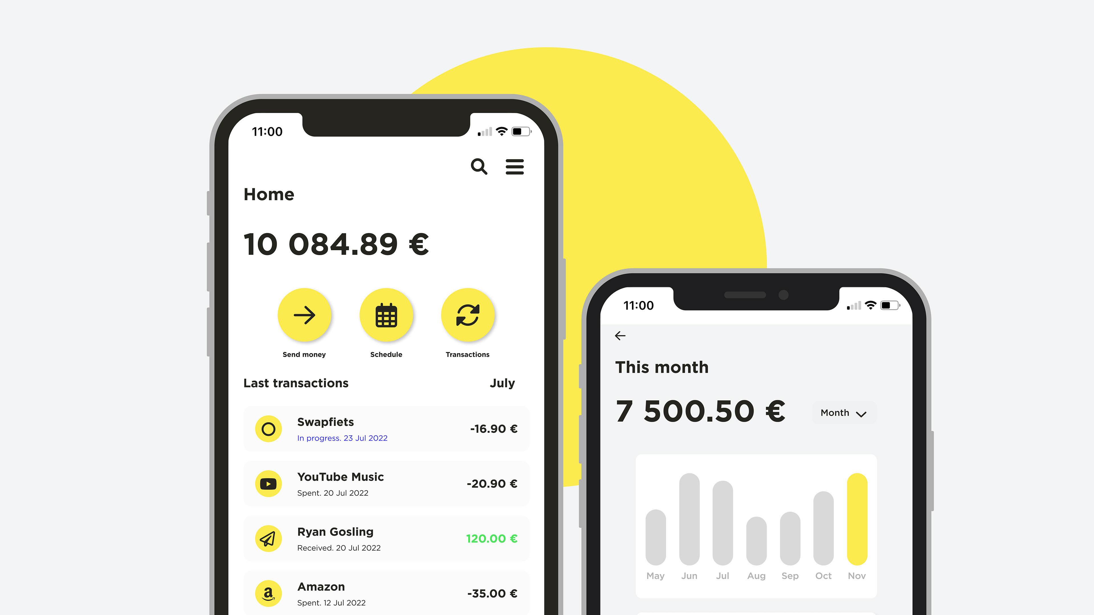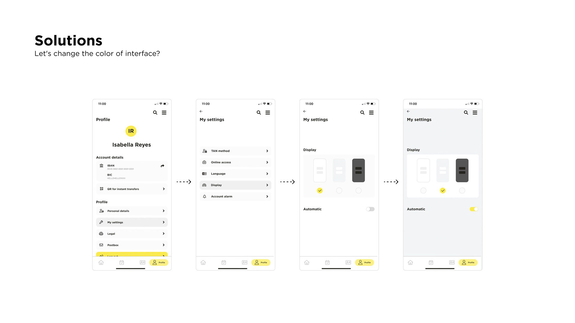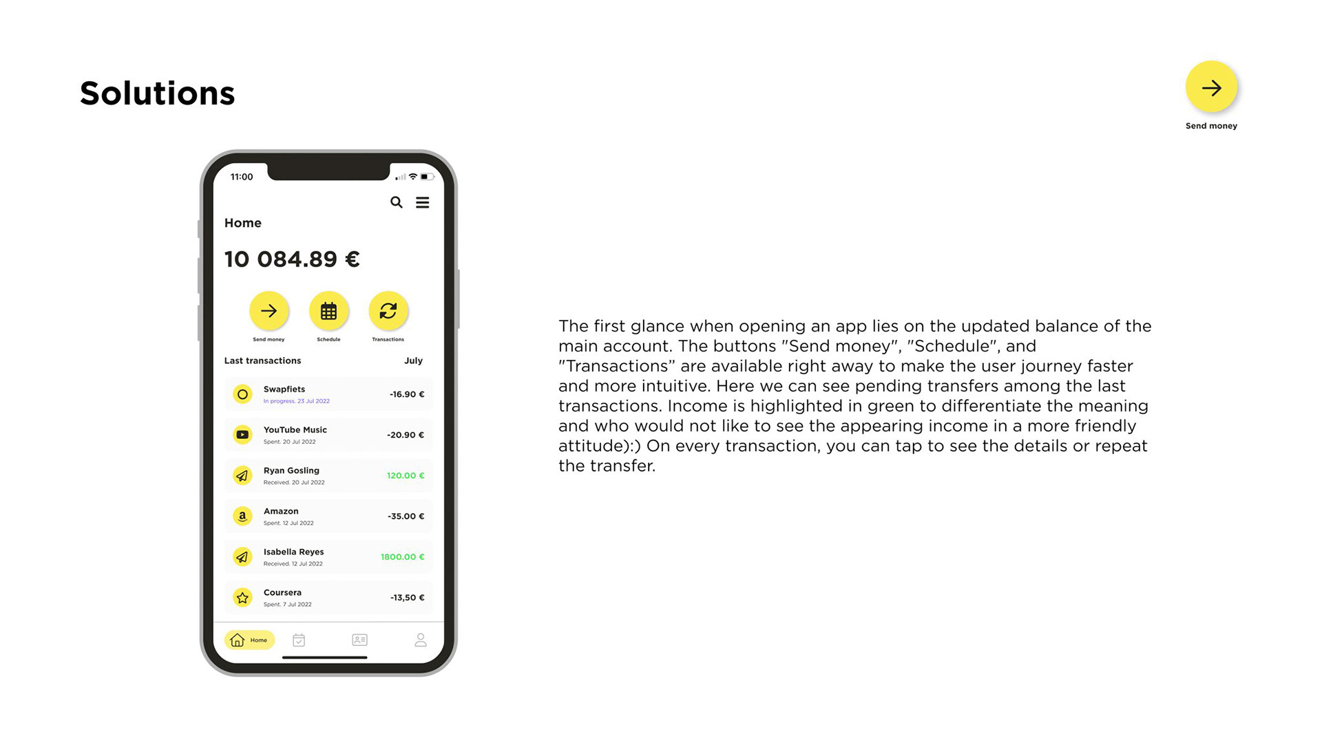The new design concept uses the yellow color to make the app more recognizable and intuitive, and it also creates a harmonious interplay with the petrol color.