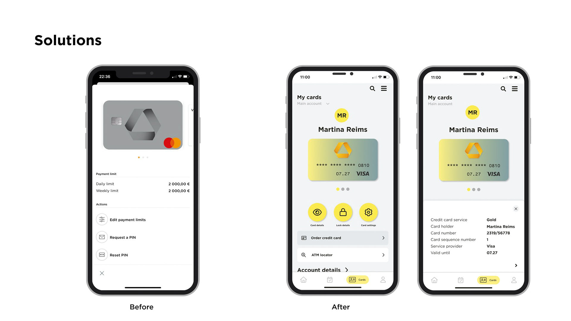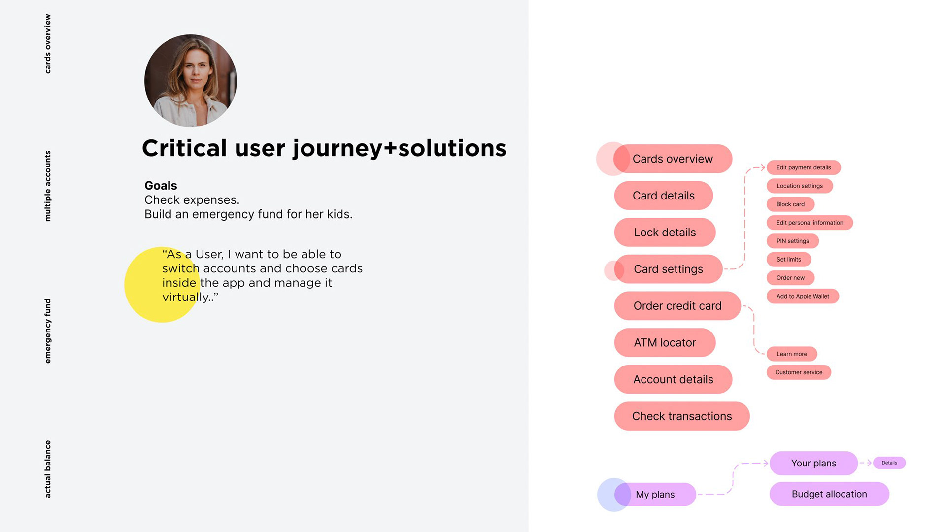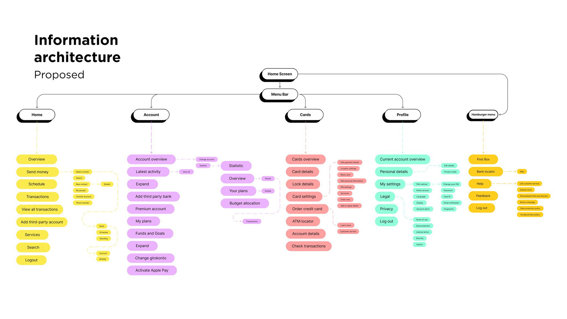 After synthesising all ideas, I identified 5 emerging themes that an app could offer: home, account, cards, profile, and hamburger menu with more structured features inside of each divided logically by purpose. The hamburger menu can hold more than before and consists of features users would use not so often