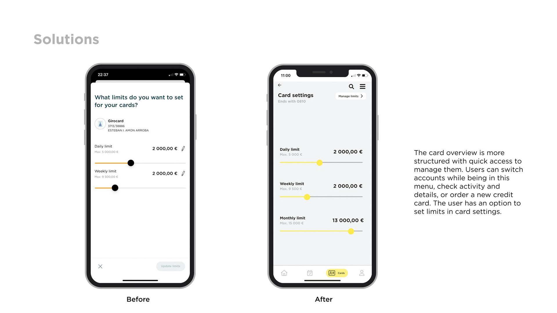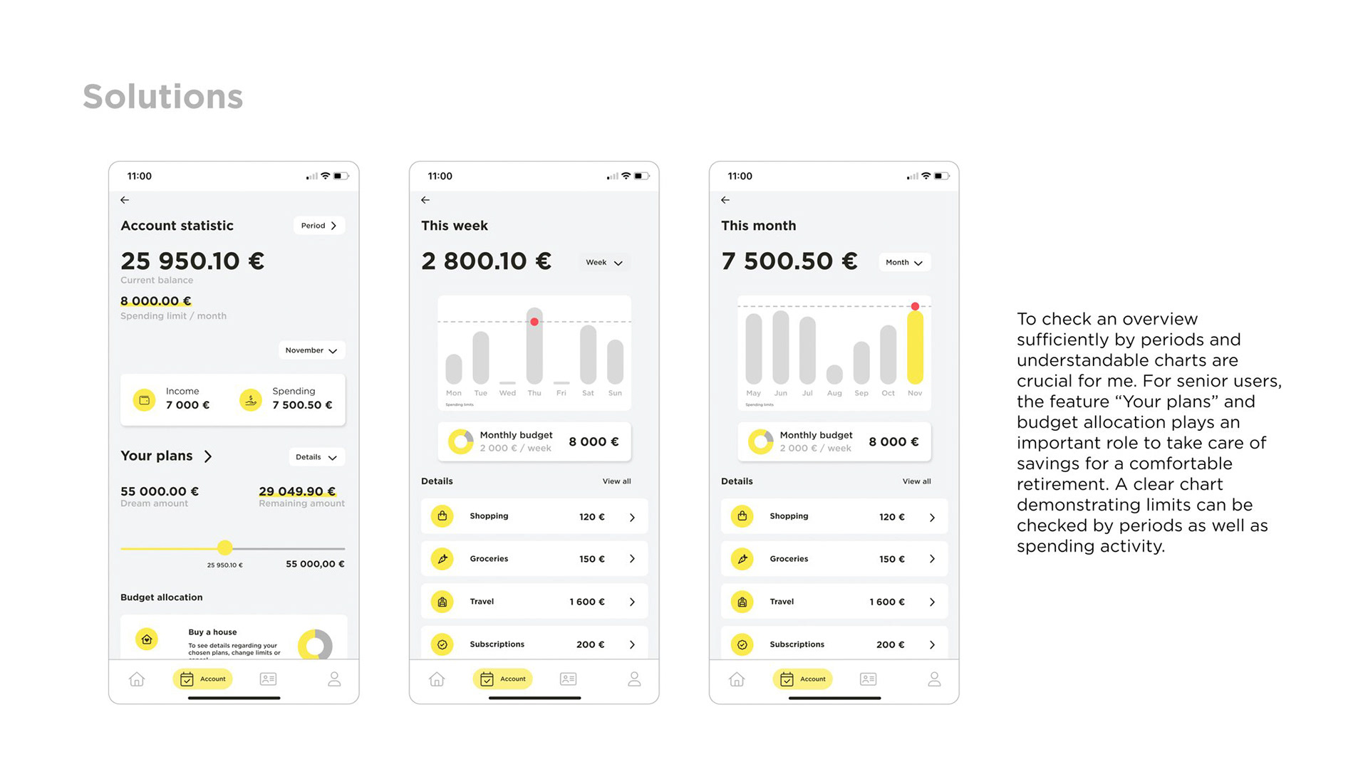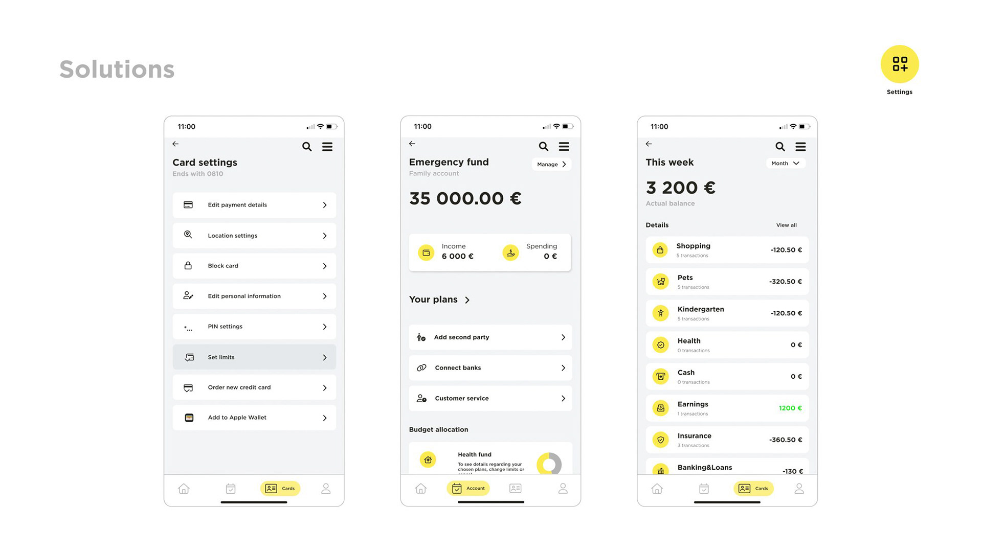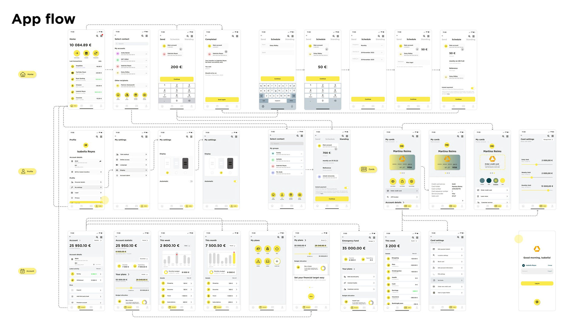 After synthesising all ideas, I identified 5 emerging themes that an app could offer: home, account, cards, profile, and hamburger menu with more structured features inside of each divided logically by purpose. The hamburger menu can hold more than before and consists of features users would use not so often