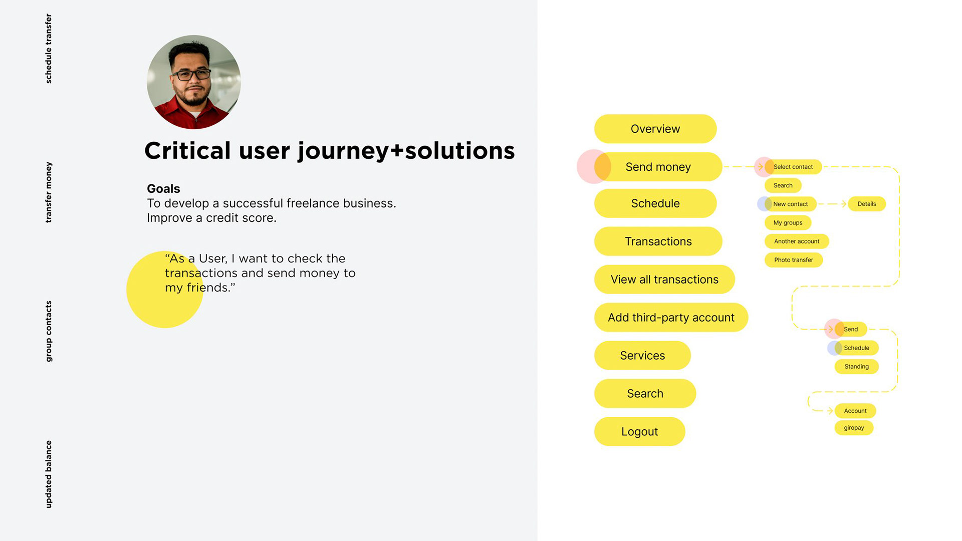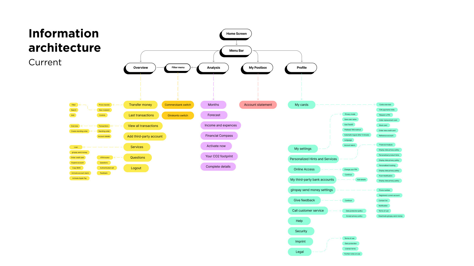 To understand more about the app structure, I created a rough rendition of the Commerzbank information architecture. Most of the core functions are not easily accessible because it is all placed in different parts of the app, filter menu has only 2 options for switching accounts service. The user gets lost easily looking for a specific option which is challenging to find.