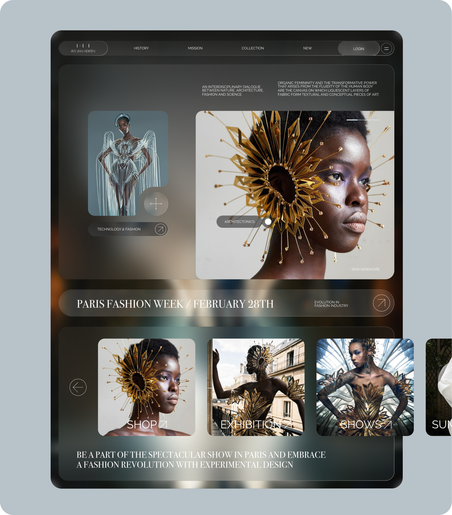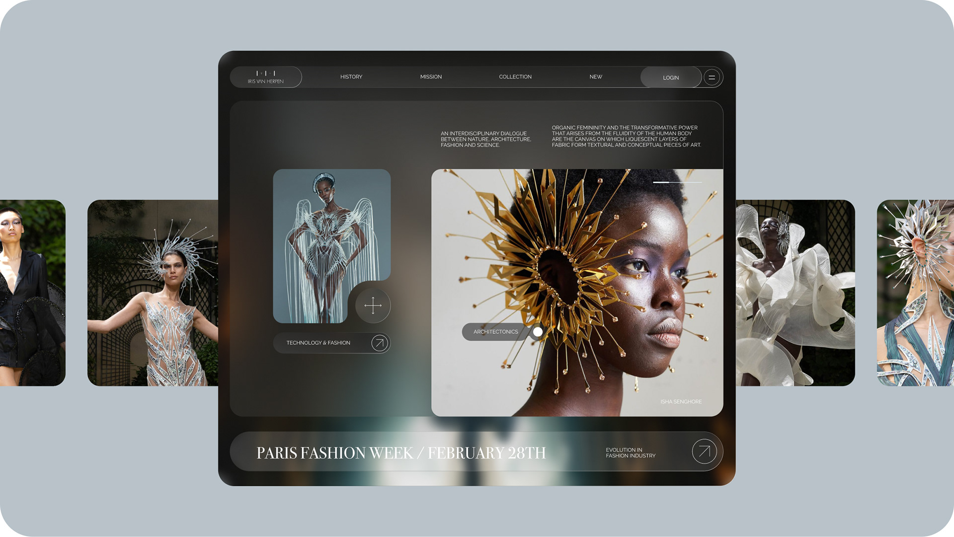 At Iris van Herpen's maison, Haute Couture becomes a boundary-defying fusion of technology and craftsmanship. Pioneering techniques and luxurious materials give rise to avant-garde wonders, challenging traditional notions of handmade fashion. The brand showcases collections bi-annually at Paris Haute Couture Week, redefining the métier as an engine of innovation. Their commitment to sustainability and materiality is reflected in an interdisciplinary approach that explores new forms of expression for a more conscious fashion future. Having always admired this designer, I appreciate the celebration of female empowerment as the maison collaborates with inspirational women, crafting bespoke designs for an international clientele. That is why I took an initiative in creating a landing page for the Summer 2023 collection, Architectonics. Through symbiotic collaborations with artists and scientists, the transdisciplinary brand challenges the future of fashion, reimagining Haute Couture in unprecedented ways. ⚜️