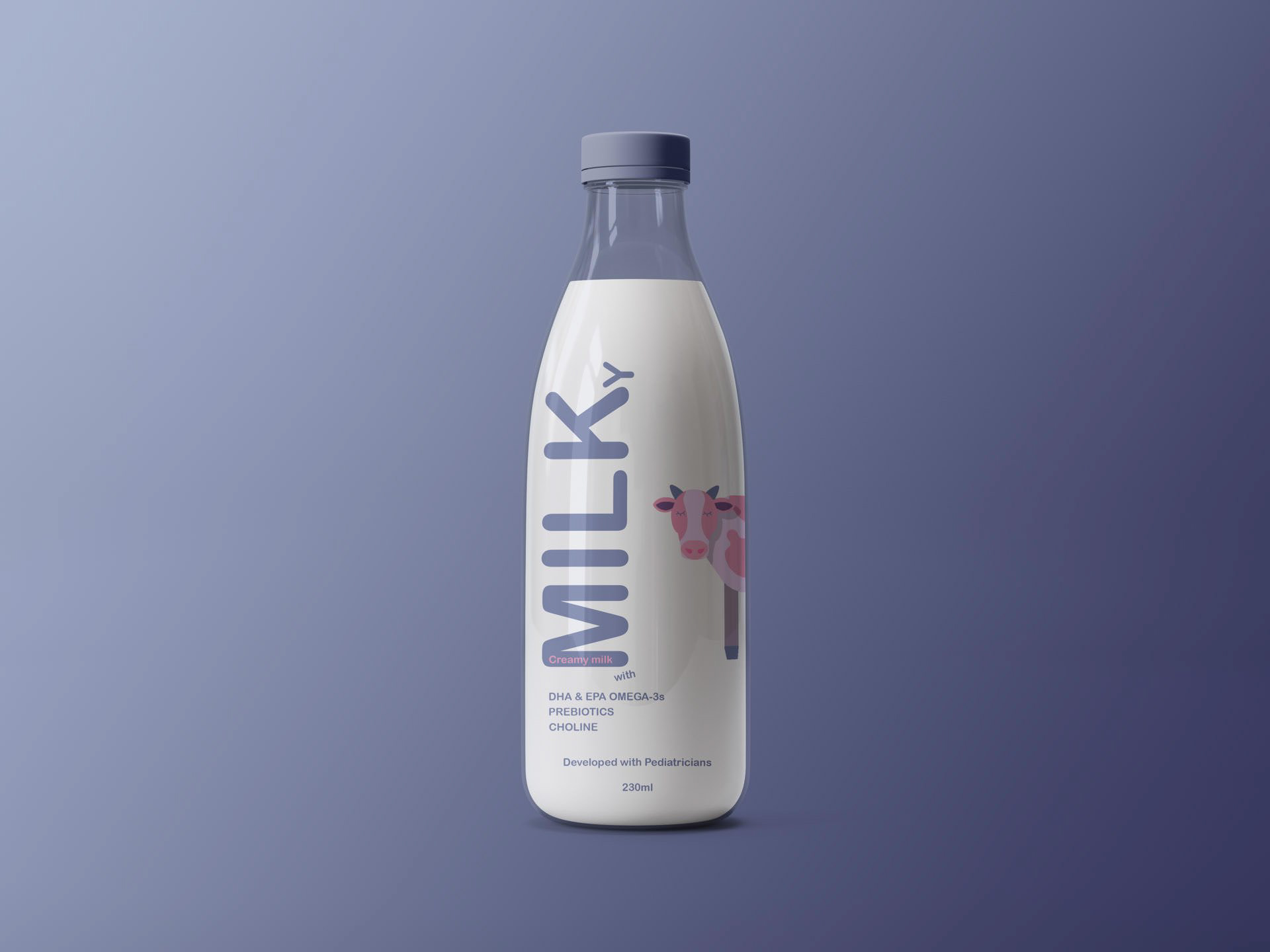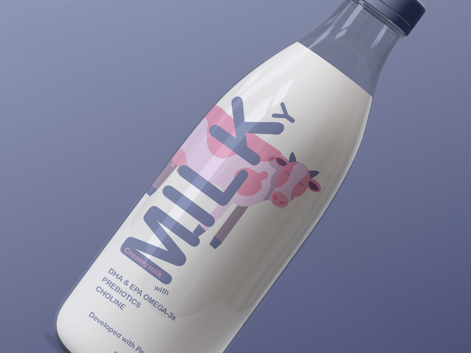 Milky's brand identity draws inspiration from children's animation, bringing joy and playfulness. Colors and shapes evoke childhood's tenderness, while a minimalistic approach connects with modern audiences. Playful yet modern typography reflects the brand's contemporary product for children, balancing design and readability.