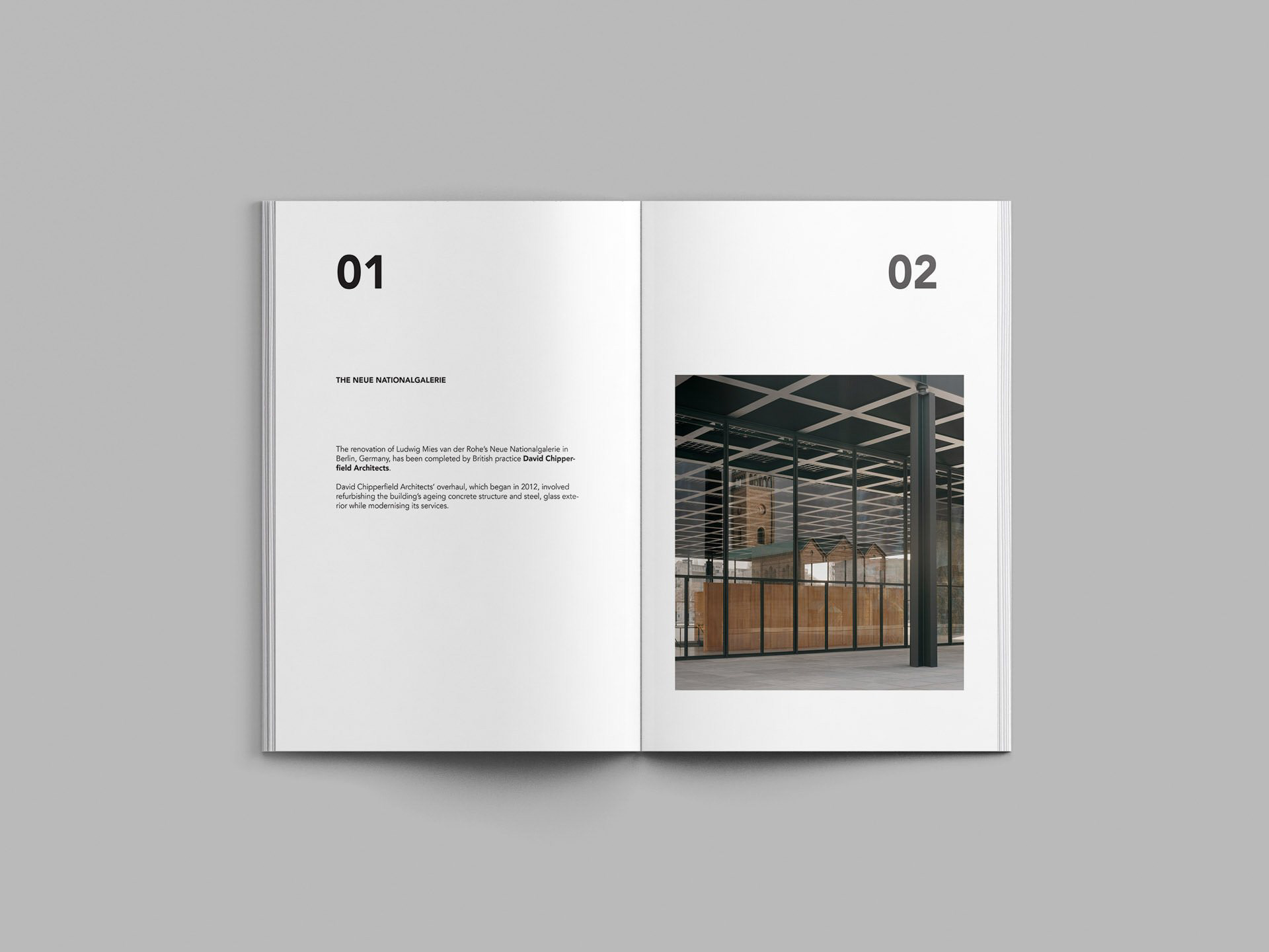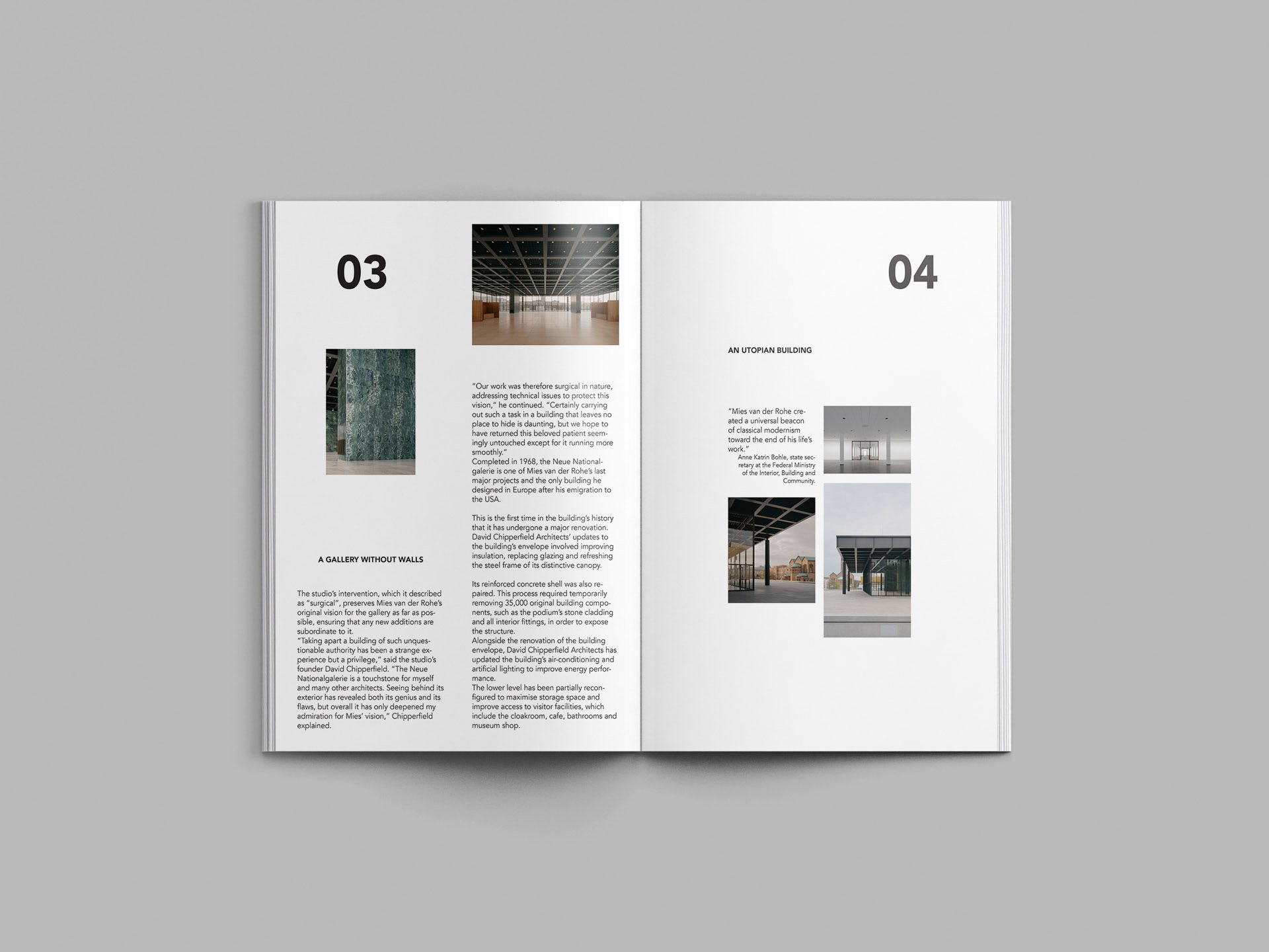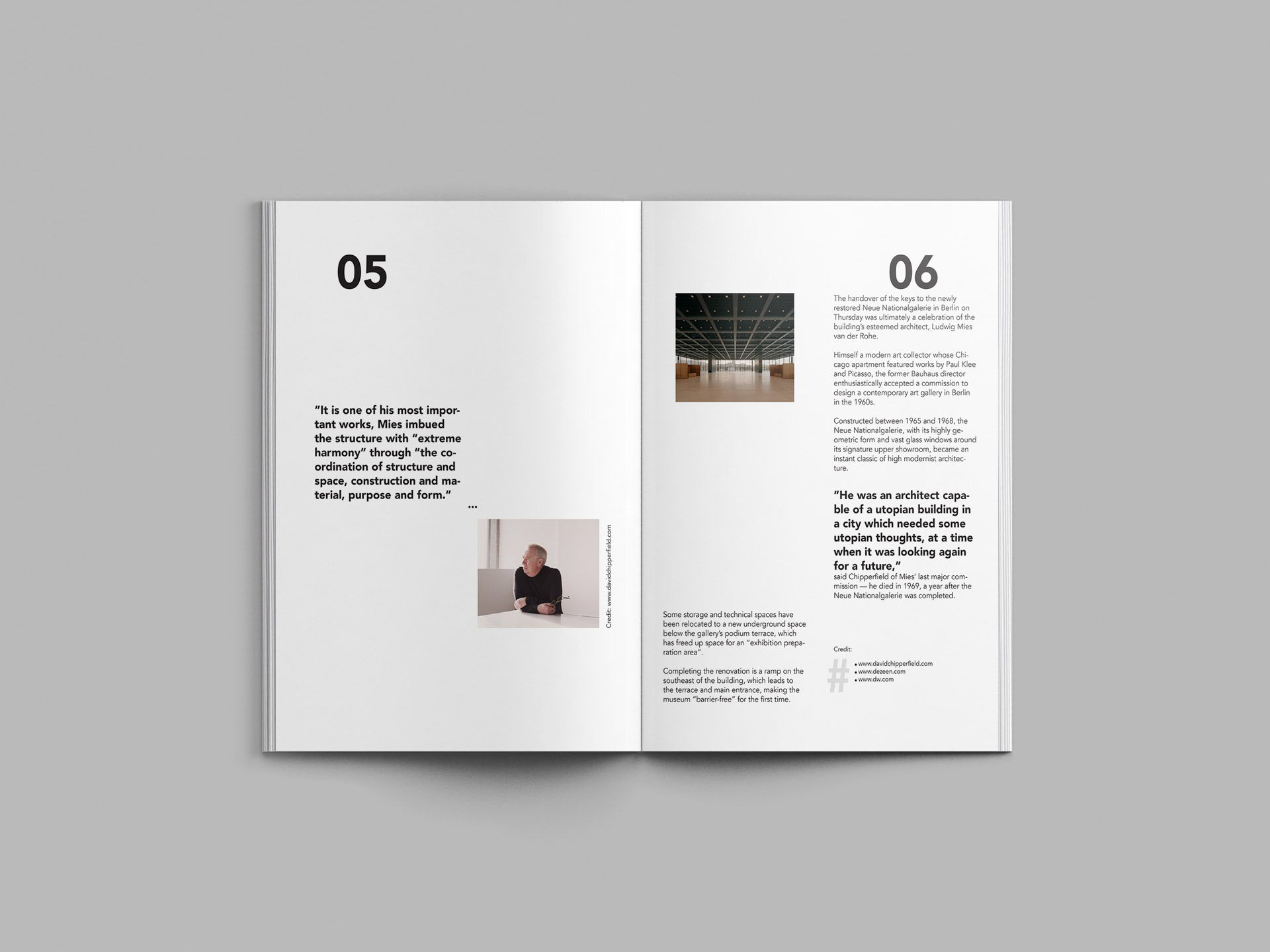 The challenge was to create an editorial design that not only narrated the architectural transformation from Mies van der Rohe's original design to Chipperfield's reinterpretation but also captured the philosophy and spirit of "Less is More." The goal was to create a visually engaging and informative booklet that resonated with architecture enthusiasts and aficionados.