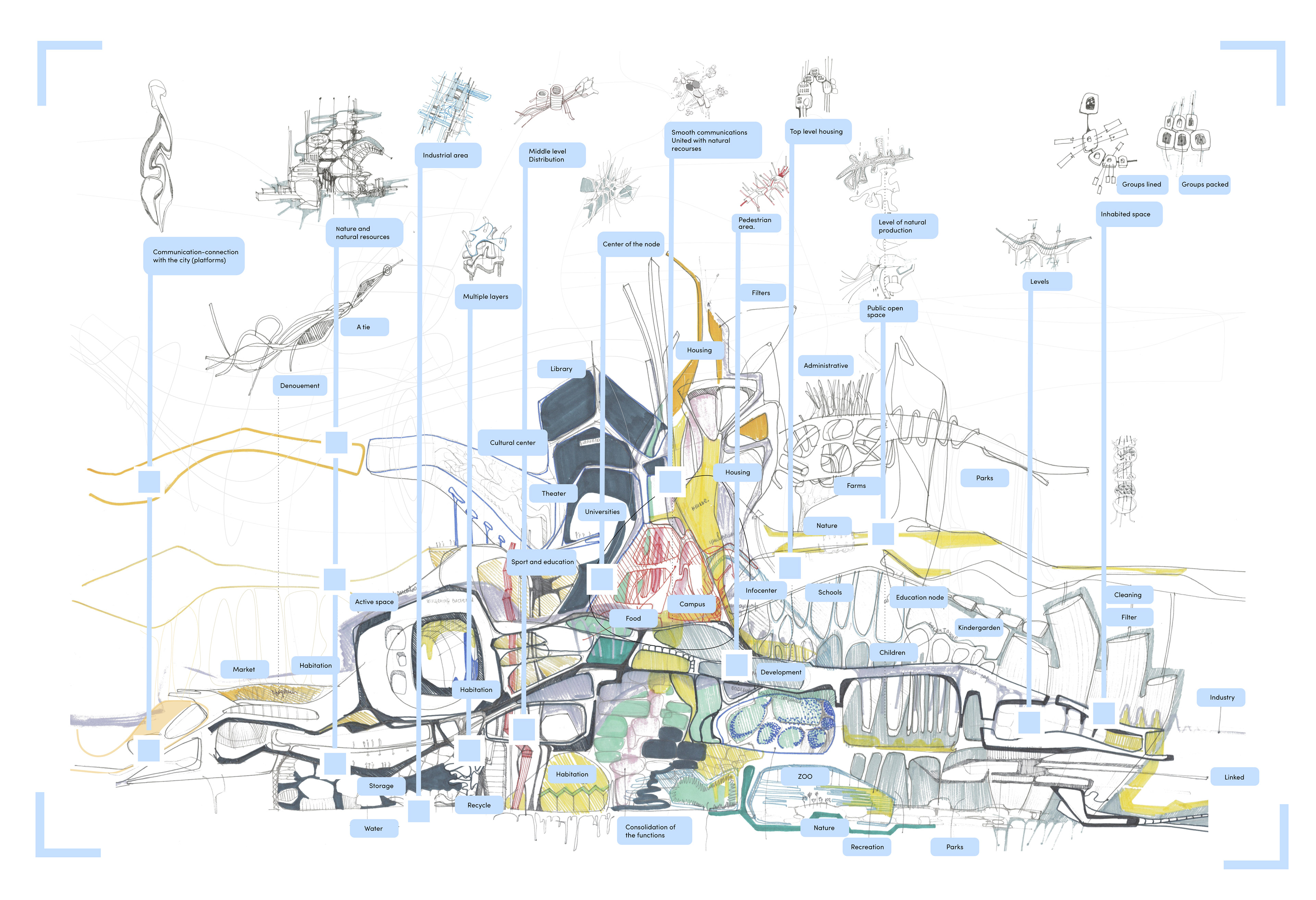The node has clear boundaries, communication with the city on four levels, and growth limits in height. The space formation schemes include the functions of nature, levels, filters, housing, public spaces, administrative elements, media center, education, and industrial farms. The node is crucial for the future city structure, replacing industrial buildings with zones for water and air purification. The city's structure shapes the right vector of human development, altering their consciousness, filtration, and the development of functional features of the territory.